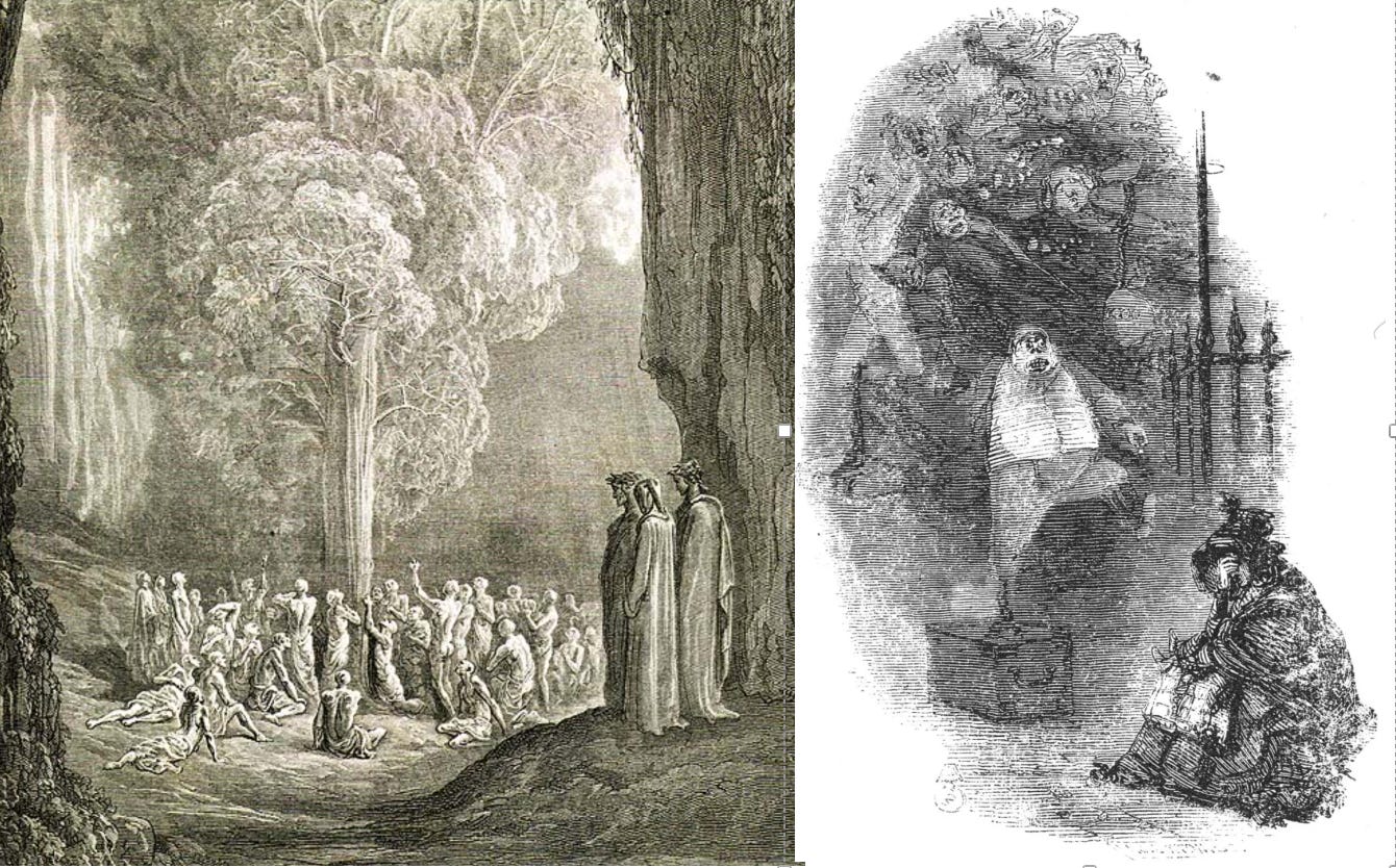 Right: Gustave Dore’s Illustration of Canto 24 of Dante’s Purgatorio, Where Gluttonous Souls Gather Around a Tree of Fruit They Cannot Eat. Left: John Leech’s Illustration of the Trapped Spirits Outside Scrooge’s Window at the End of Stave I.