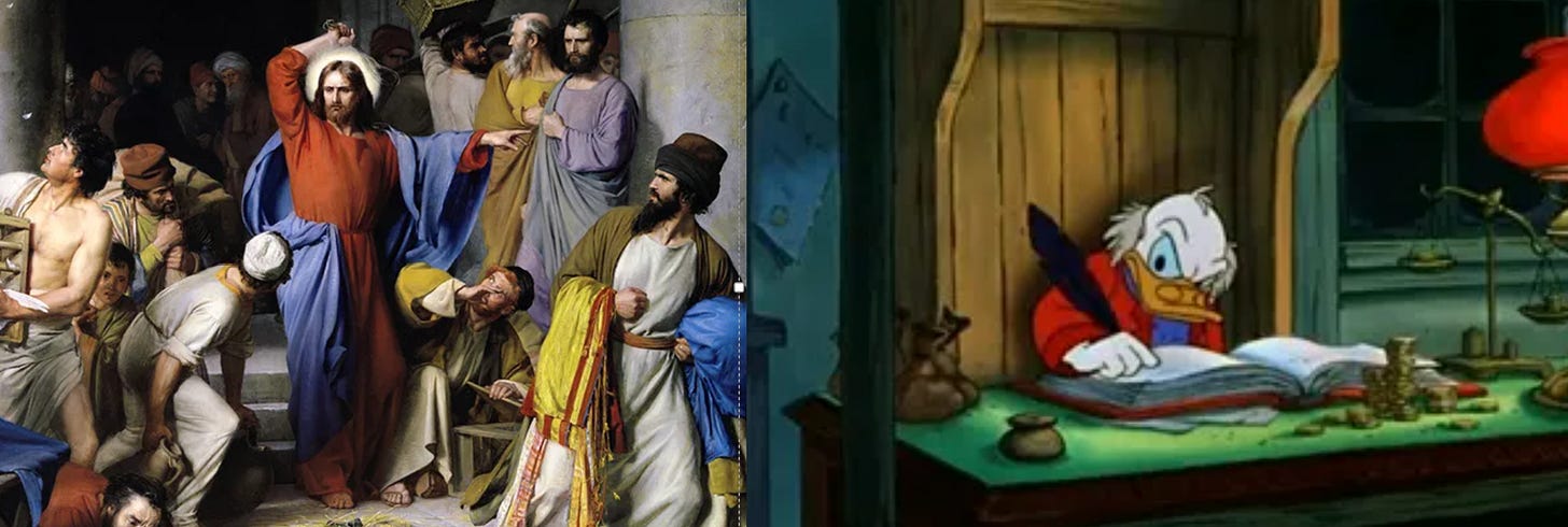 Jesus Cleansing the Temple of Moneylenders. Not Unrelated: Scrooge McDuck.