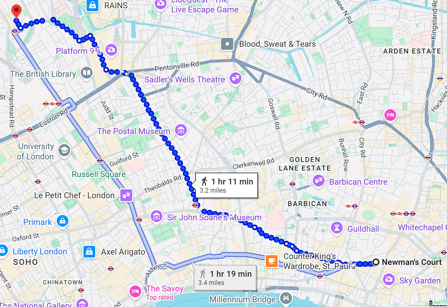 Here, Bob Cratchit asks for Christmas Day off, which Scrooge reluctantly relents to. When Bob leaves, he slides down Cornhill 20 times before walking home. Cornhill is an actual hill, a small hill, neighborhood just past Mansion House that Bob could have sled back in the day. But, and this is a detail that Dickens leaves out: Bob Cratchit’s walk home would take about one hour and thirty minutes.