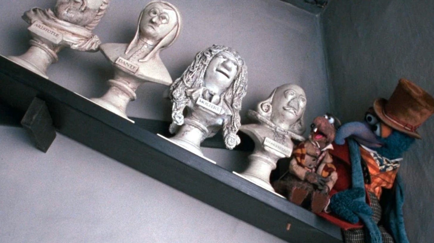 That’s why this allusion to Hamlet’s father opens the story: Dickens always worked towards Shakespeare’s reputation, so it makes sense that he would establish Marley’s ghost as something out of Shakespeare. Don’t take my word for it: Look again at Gonzo-Dickens on the shelf at Scrooge’s schoolhouse: The Muppets got this too.