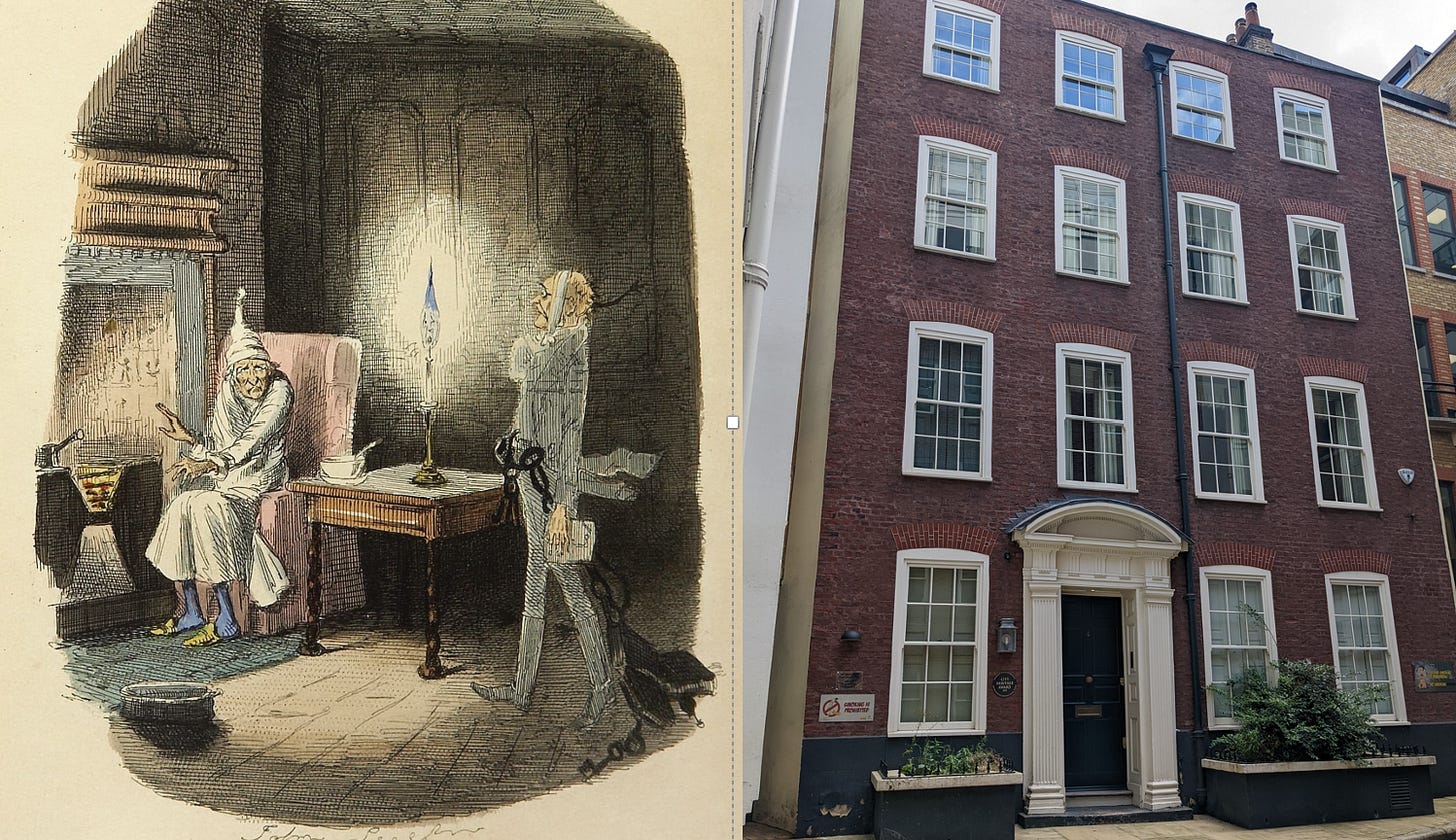 John Leech’s Illustration of Marley’s Ghost Confronting Ebenezer Scrooge for the Original 1843 Publication of A Christmas Carol. On the Right, the House that Richard Jones, London Tour Guide Specializing in Dickens, Identified as the Likely Model for the House Scrooge Inherited from Jacob Marley.
