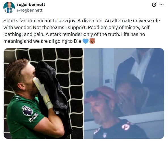 Listening to Rog is an emotional journey: The Thrill of Victory and the Agony of Defeat in the same episode. Rog’s humanity carved out Men in Blazers’ niche in the sports world: MiB exists for fans of all soccer clubs to feel their feelings. At its best, Men in Blazers is the communal experience for just, you know, dealing with whatever your team is putting you through right now.