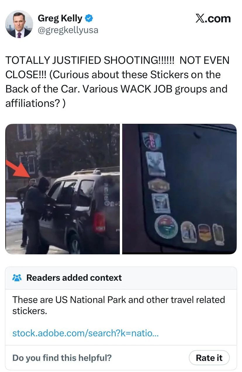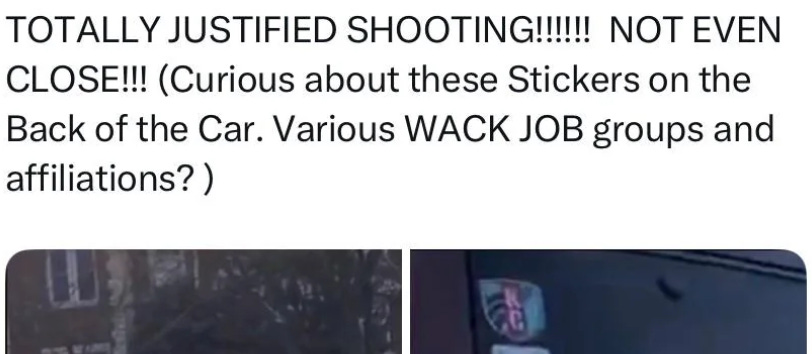 And pointed to the stickers on the back of Renėe and Becca’s car. Greg Kelly went into character assassination mode to justify the murder, trying to paint Renėe and Becca as some sort of “domestic terrorists” who “deserved” to be shot.
