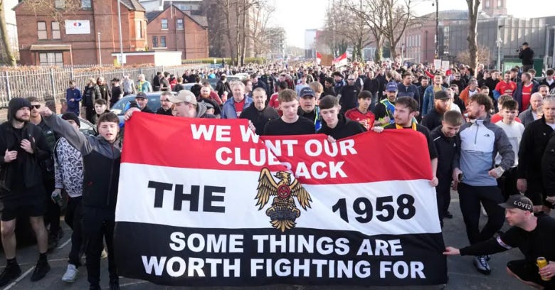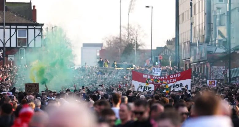 Manchester United Fans Protesting the Glazer Family’s Ownership in 2025. The Green and Gold are Symbols of the Protest, Recalling United’s Roots as Newton Heath in 1878, When the Club Was Founded as a Working Class Association That Grew Out of the Horrors of Industrial Factories in the Manchester Textile Industry.