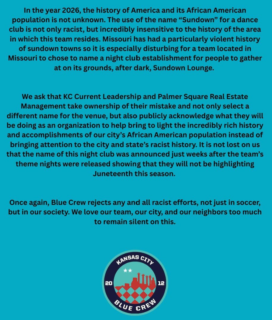 This essays focuses on the LGBTQIA+ side of things because of Renee Good, but you could do an entire other essay on the tension between ownership and Black fandom: The seeming attempt to create the Current as an upscale sports lifestyle brand for white folks. This essay is already way, way too long, but to take a recent example, ownership apparently approved of naming Current Landing’s first nightclub “Sundown.”